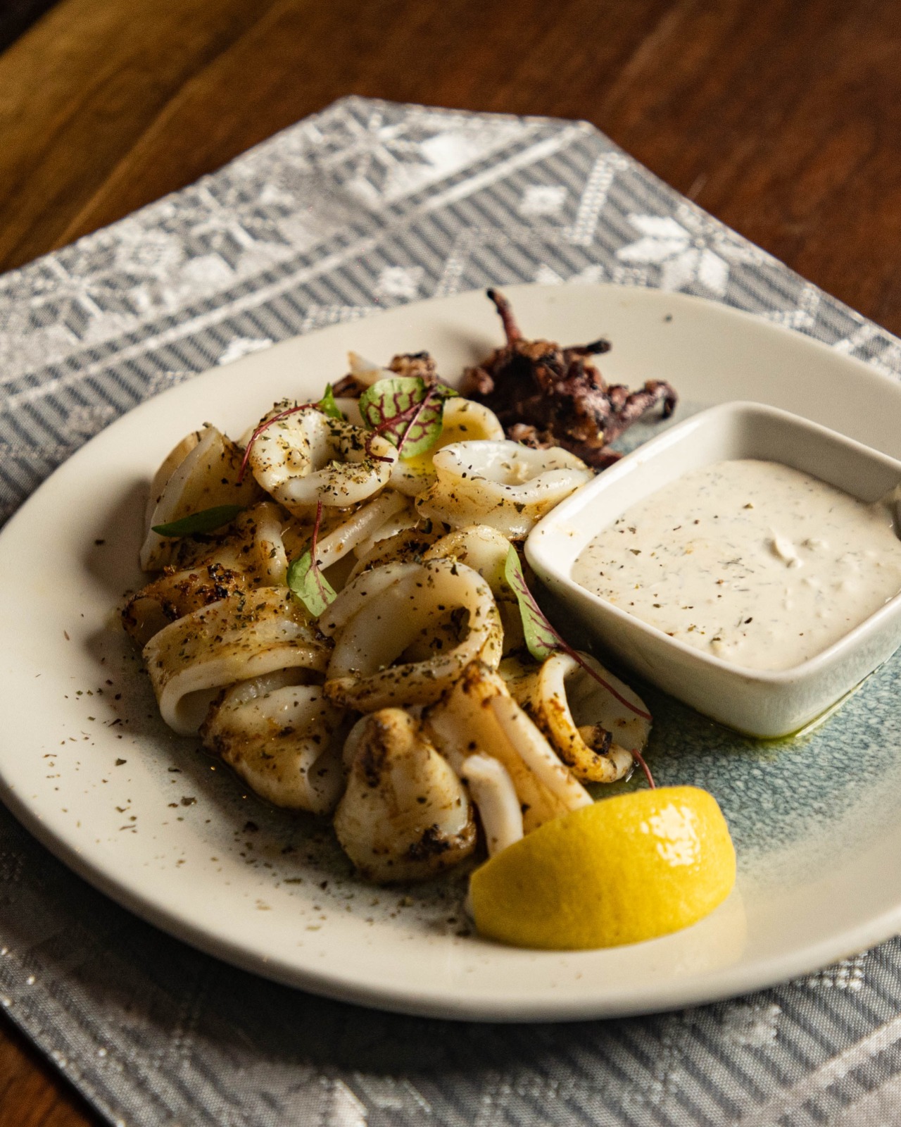 Kalamari + Shrimp + Mussels + Spinach + Onions + Kefalotiri Cheese + Spicy Ouzo Tomato Sauce